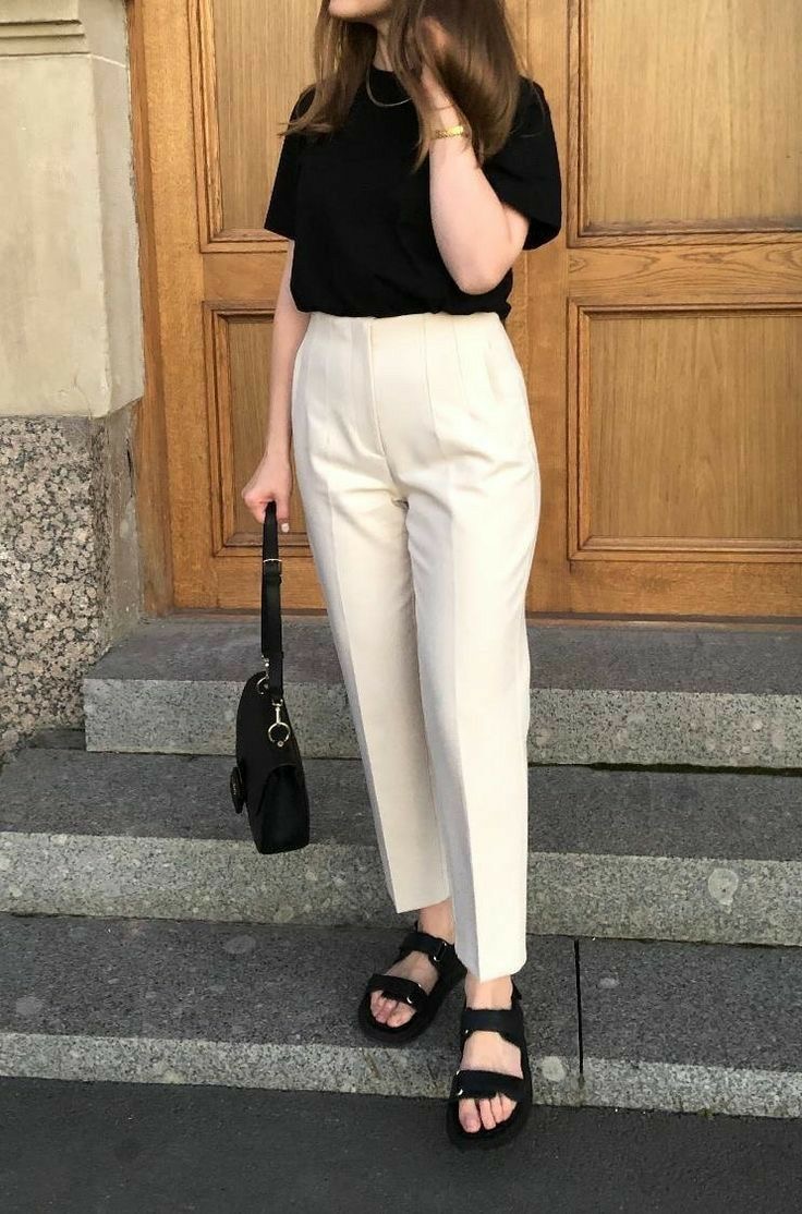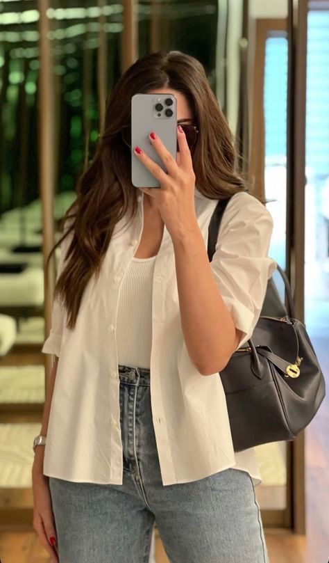 جينز واسع + بلوزة قطنية بسيطة.